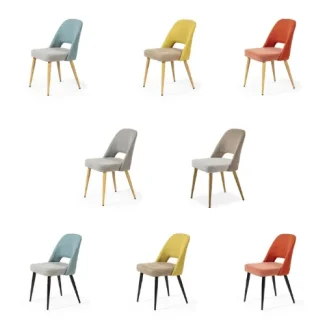 Com assento estofado, disponível em azul, cinza, verde ou bege com pés metálicos pretos que reforçam a elegância da peça.