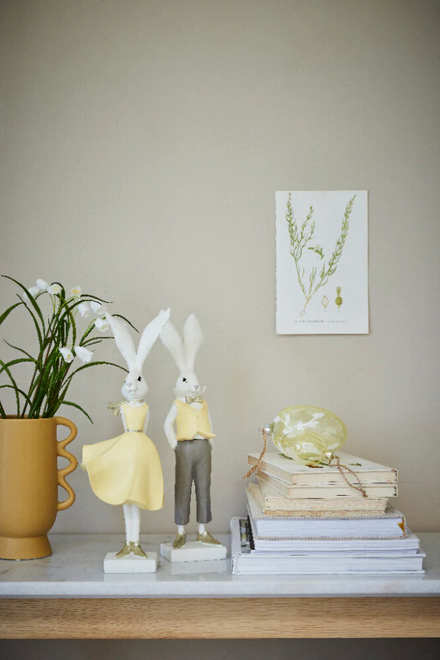 Este adorável coelhinho decorativo é o toque especial que faltava na tua decoração de Páscoa! Com um visual elegante — colete e calças ao estilo vintage — e um charme irresistível, ele promete arrancar sorrisos a quem passar por perto. Produzido em poliresina de fácil limpeza, está disponível em duas versões: dama e cavalheiro, com as cores suaves e alegres típicas da época. Inspirado no estilo rockabilly dos anos 50, este coelhinho não só é uma peça cheia de personalidade, como também traz um espírito leve e divertido à tua casa durante toda a primavera. Esta peça decorativa é perfeita para quem adora detalhes únicos e quer criar um ambiente acolhedor e cheio de alegria nesta Páscoa.