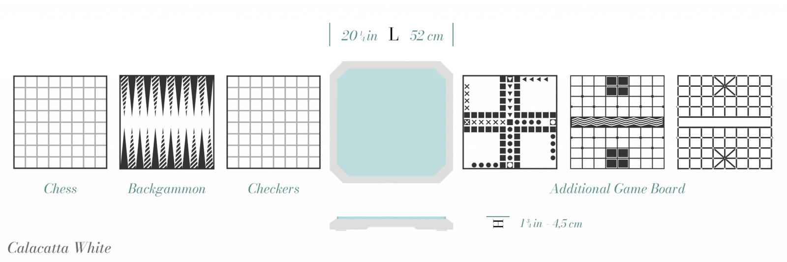 Folhas de Jogo: Um único tabuleiro pode ser usado para jogar quatro jogos diferentes. Graças à intercambiabilidade, as folhas finas de metal gravadas incluem: