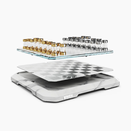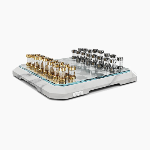 Peças de Xadrez: Peças de xadrez feitas de cilindros de vidro borossilicato extra transparente e torneado, decoradas com ouro 24K e latão cromado.